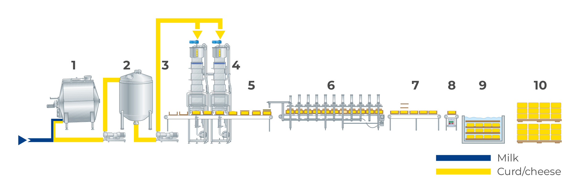 - For (semi-)hard cheese, collection of curd for pre-pressing and/or final moulding/pressing and brine salting