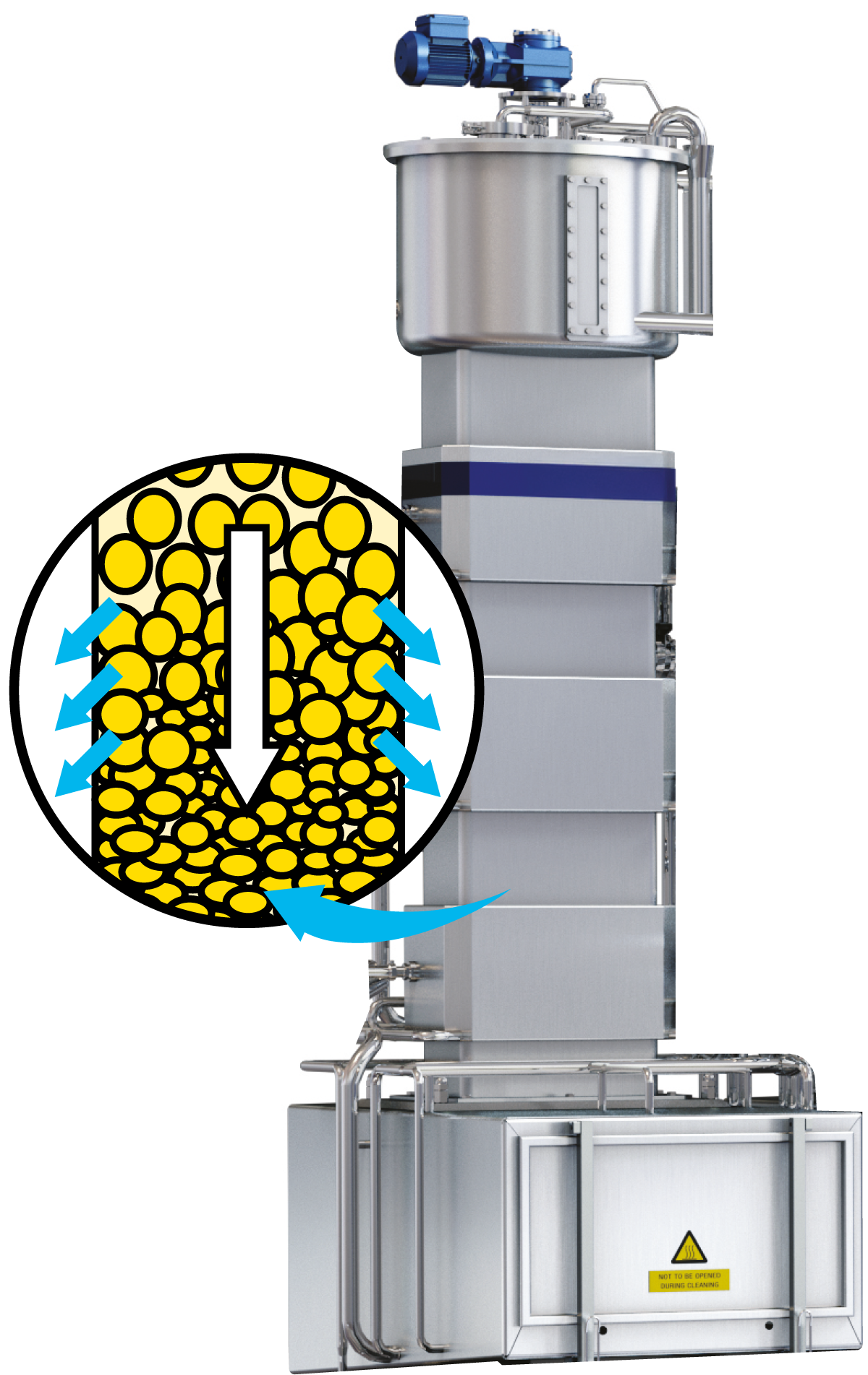 After dewatering, the acid casein is ground and packed in sacks. The technique for the production of acid casein developed by Pillet, France, should also be mentioned. After pre-heating to 32 °C, the skim milk is acidified and introduced into a coagulation unit (Figure 16.46). Coagulation is completed after heating to about 45 °C by direct steam injection. De-wheying in a decanter is followed by counter-current washing in one or two specially designed washing towers (Figure 16.47).