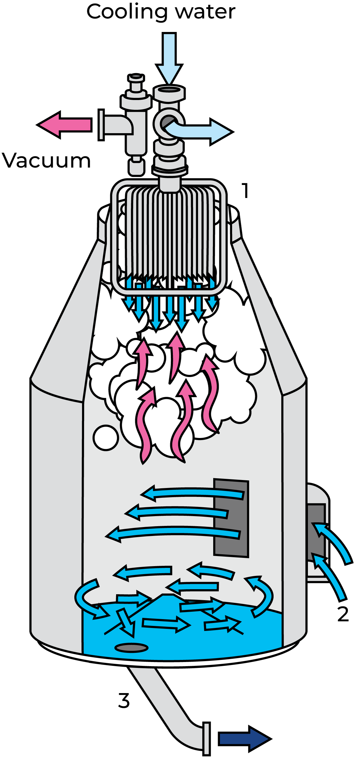 The vapour passes a built-in condenser in the vessel, condenses, and runs back into the milk, while the boiled-off air, together with non-condensable gases (certain off-flavours) is removed from the vessel by the vacuum pump.
