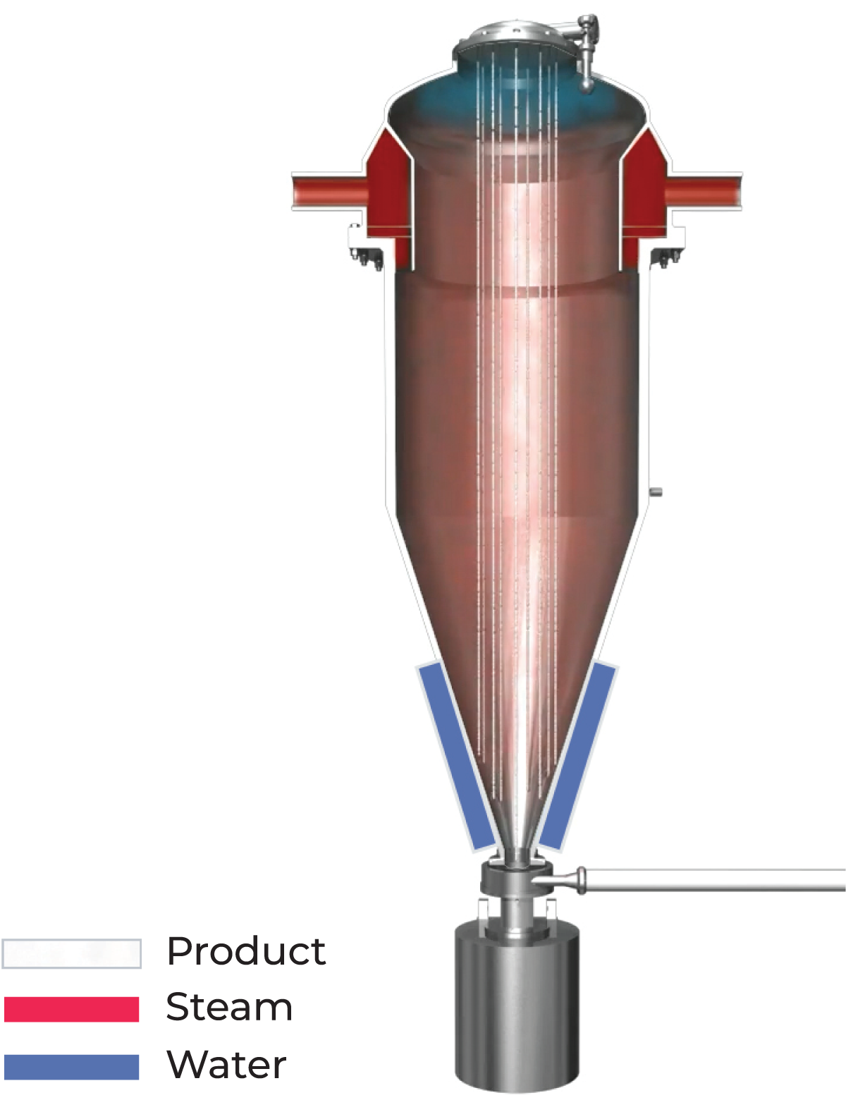 It is also possible to combine direct heating and indirect cooling without subsequent flash cooling. In this case, the condensate created by the steam while heating will dilute the product.